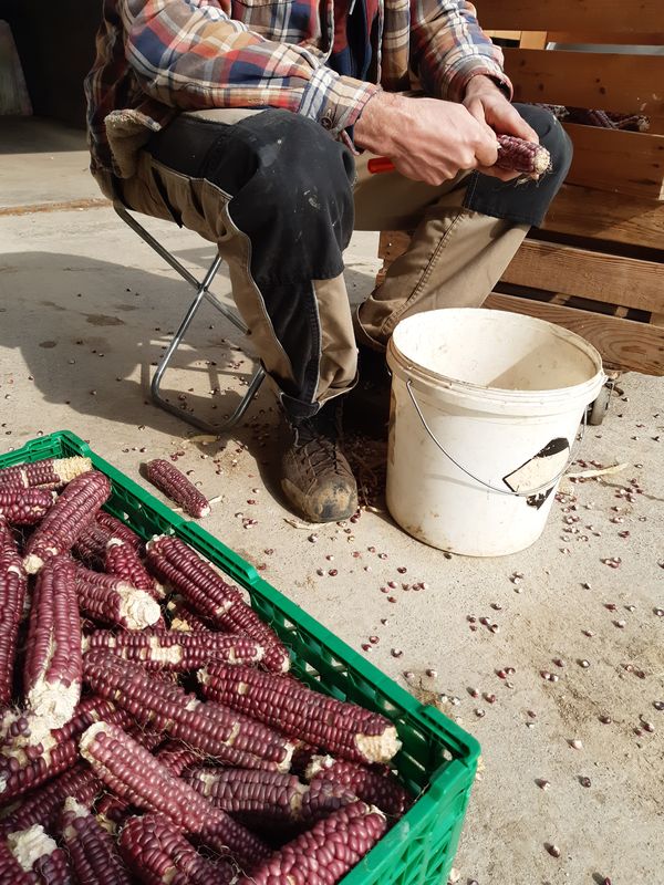 Es ist schwierig eine Maissorte rein zu halten. Wenn Mais blüht, kann er von umliegenden Feldern fremdbestäubt werden. So schleichen sich oft Maiskörner rein, die wir nicht wollen. Bei der grünen Sorte ist es besonders schwierig, diese rein zu halten. Schnell ist der Kolben grün-gelb gesprenkelt. Deshalb erlesen wir das Saatgut. Die unerwünschten Körner werden vorerst vom Kolben entfernt. Die übrigen Körner werden danach vom Kolben gerieben und sind dann bereit für die Aussaat.